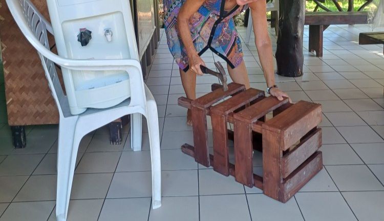 Frei nach dem Motto „Was Du heute kannst besorgen…“ habe ich mir heute Morgen Hammer und Nägel geben lassen und das Untergestell für den Wasserspender erstmal wieder zusammen gedengelt. Konnte das nicht mehr mit ansehen und ein bisschen sinnvolle Beschäftigung tut auch mal gut. Die (und ich) haben uns kaputt gelacht: Typisch, die Deutschen 😅.