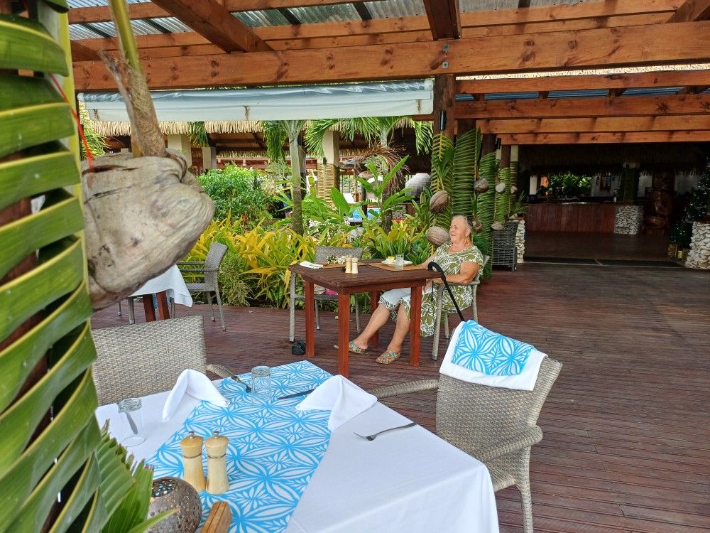 Lange Rede, kurzer Sinn, Sonja hat ihren Gehstock und mich nach dem großen kurzen Regenschauer ins Auto gepackt und wir fuhren zum Luxusresort auf Akitua. Ich kam mir ein wenig underdressed vor, weil ich mir über den Bikini nur meinen alten (+ leider schon löchrigen), pinken Pareo gewickelt und irgend ein olles Strandshirt an hatte.