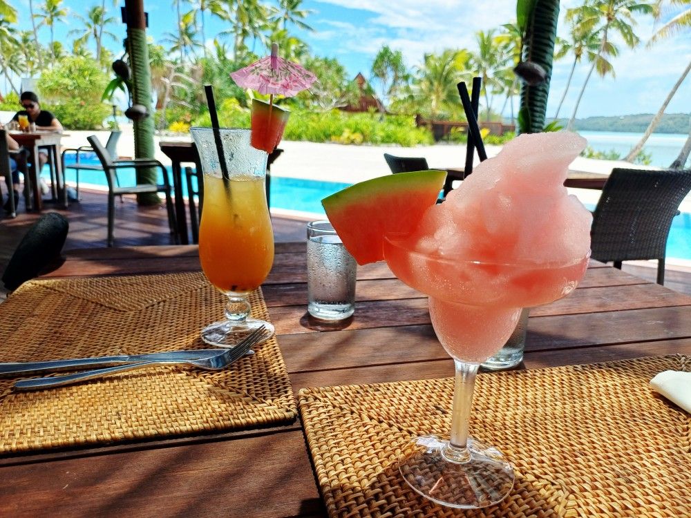Erst wurden wir vom Boot übergesetzt, haben an einem Tisch neben dem kleinen Infinity-Pool platz genommen und uns einen köstlichen Cocktail bestellt.