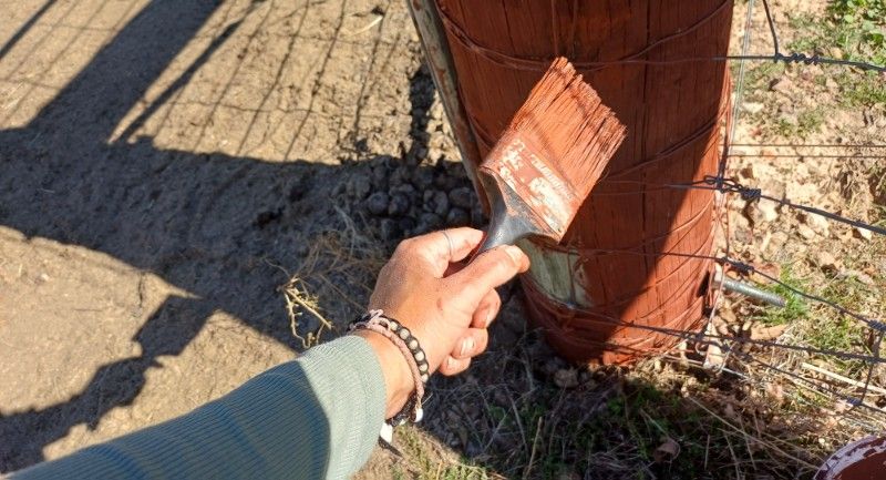 Heute hab ich z.B. die ersten von rund 20 Holzpfählen der Pferdeweide mit Holzschutz gestrichen. Wenn da nicht diese blöden Drähte wären …