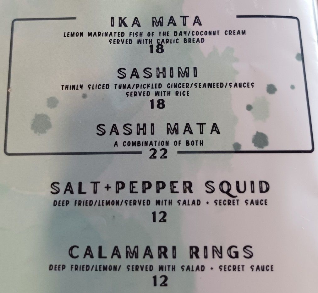 Dabei war ich gestern Abend ja schon schlemmen in „Charlies Bar“, inkl. Livemusik. Roher Fisch wird hier im Übrigen viel gegessen. Witzig ist, dass diese Speisen als „Fertiggericht“ auf dem Markt oder im Supermarkt 12-15 NZ$ kosten, also unwesentlich weniger. Aber natürlich nicht so appetitlich angerichtet.