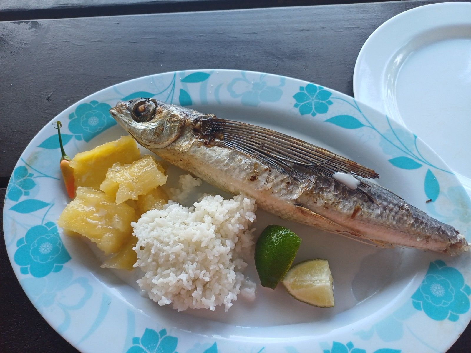 Dank des gestrigen Tipps, habe ich mich heute morgen um 6:30 Uhr aufgemacht, um auf dem Markt zu frühstücken. Und zwar in einem abseits gelegnen Laden, der quasi nur 4 Dinge hat – gegrillten oder rohen fliegenden Fisch, Reis und Tapioka (Pfeilwurz)! Fisch kommt auf den Teller, Beilagen nimmt sich jeder aus großen Alutöpfen selber. Limetten und Chilischoten nach Bedarf und auf dem Tisch stehen mit frischer Kokosmilch gefüllte PET-Wasserflaschen und Salz zur Verfügung. Gegessen wird mit den Fingern. Einfachheit ist die ultimative Raffinesse. Es hat ganz fantastisch geschmeckt.