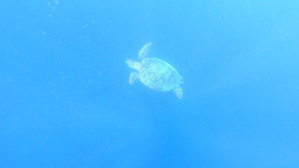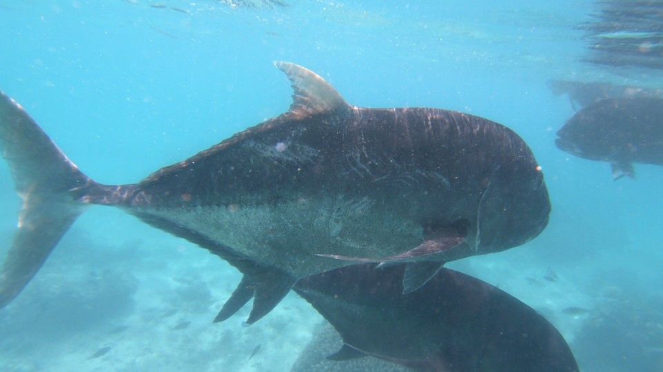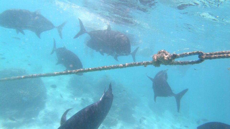 So haben wir mit großen Meeresschildkröten geschnorchelt, Stachelrochen in einer Riffpassage, beobachtet, sind mit riesigen schwarzen Stachelmarkrelen geschwommen,