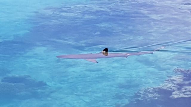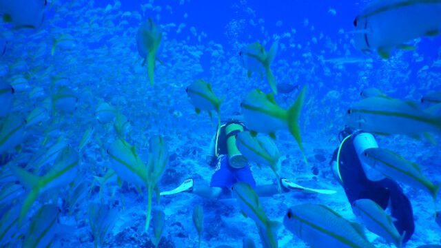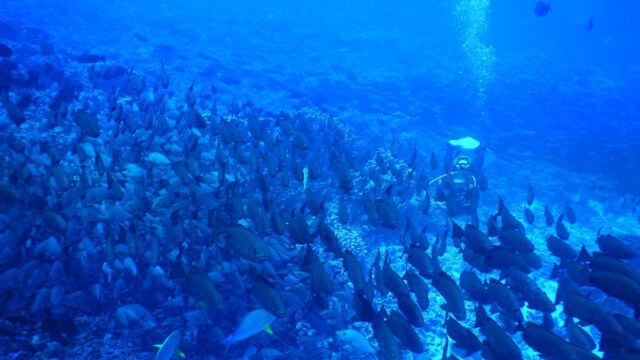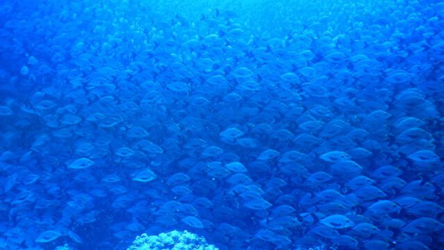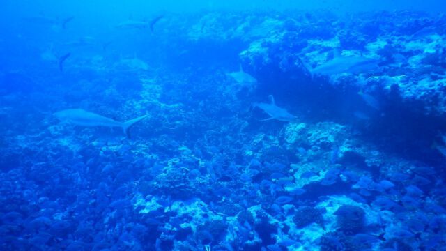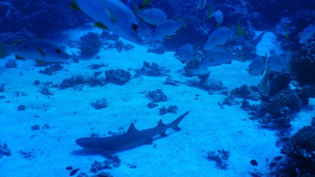 Man war also ständig – auch in nächster Nähe – von Grauen, Schwarz- und Weißspitzenriffhaien umgeben. Ein Schwarm Thunfische und Stachelmarkrelen kam vorbei und in auf etwa 18 m wimmelte es nur so von Rifffischen zwischen den Korallen. Am schönsten waren für mich jedoch riesige Fischschwärme (Großschulen-/Gelbflossen-Meerbarben, Soldaten- & Doktorfische und Buckel-Schnapper, glaub ich)