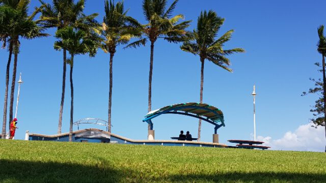 Es gibt eine lange Strandpromenade „The Strand“ mit Kinderspiel- und -wasserspielplatz (überhaupt finde ich Australien bisher sehr kinderfreundlich), Trimmdich-Geräten und den üblichen Grillplätzen.
