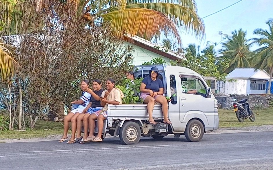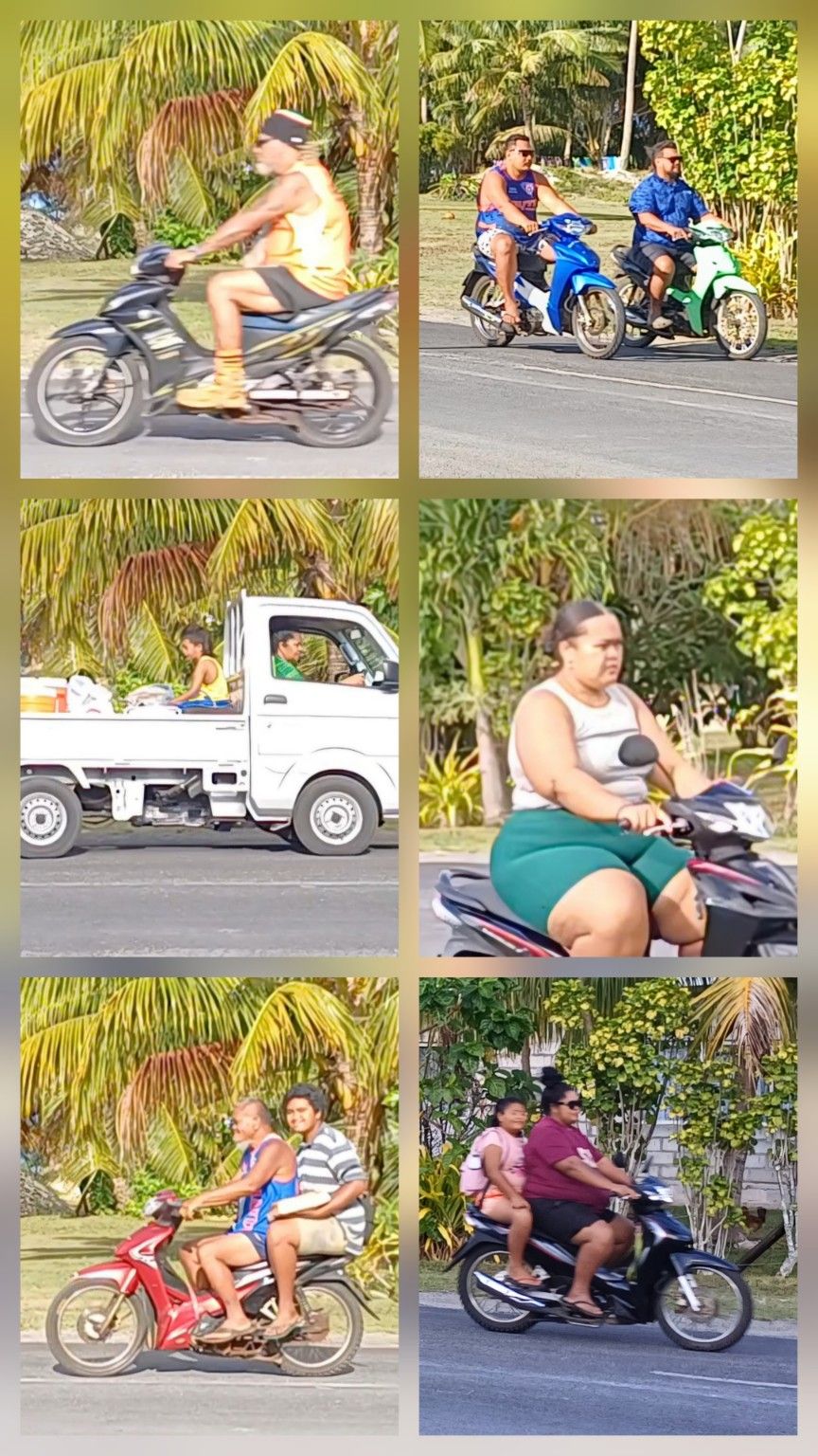 Es ist interessant an der Straße zu sitzen und all die Roller und ein paar Autos vorbei fahren zu sehen. Sieht nicht so aus, als gäbe es so etwas wie den TÜV o.ä. und auch sonst ist das alles sehr locker hier. Eine Helmpflicht wurde von der „Inselregierung“ abgelehnt (die Pflicht existiert auf der Hauptinsel Rarotonga und wird streng kntrolliert!).