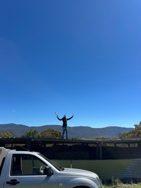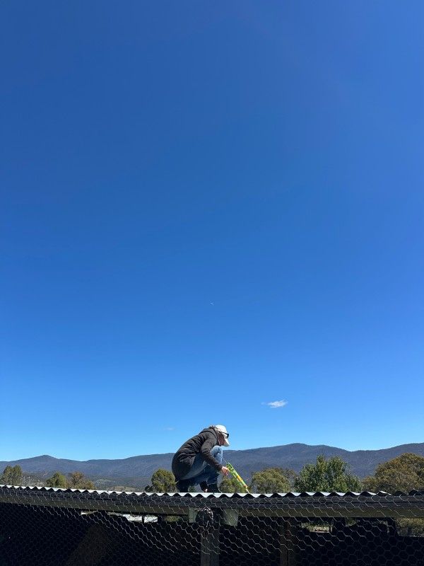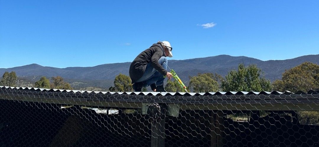 Tagsüber ist es dann strahlendblau am Himmel. Wir haben die Zeit genutzt, um das Wellblechdach mit Silikon zu reparieren, damit durch die alten Bohrlöcher der Regen nicht in den Heuschober tropft.💪